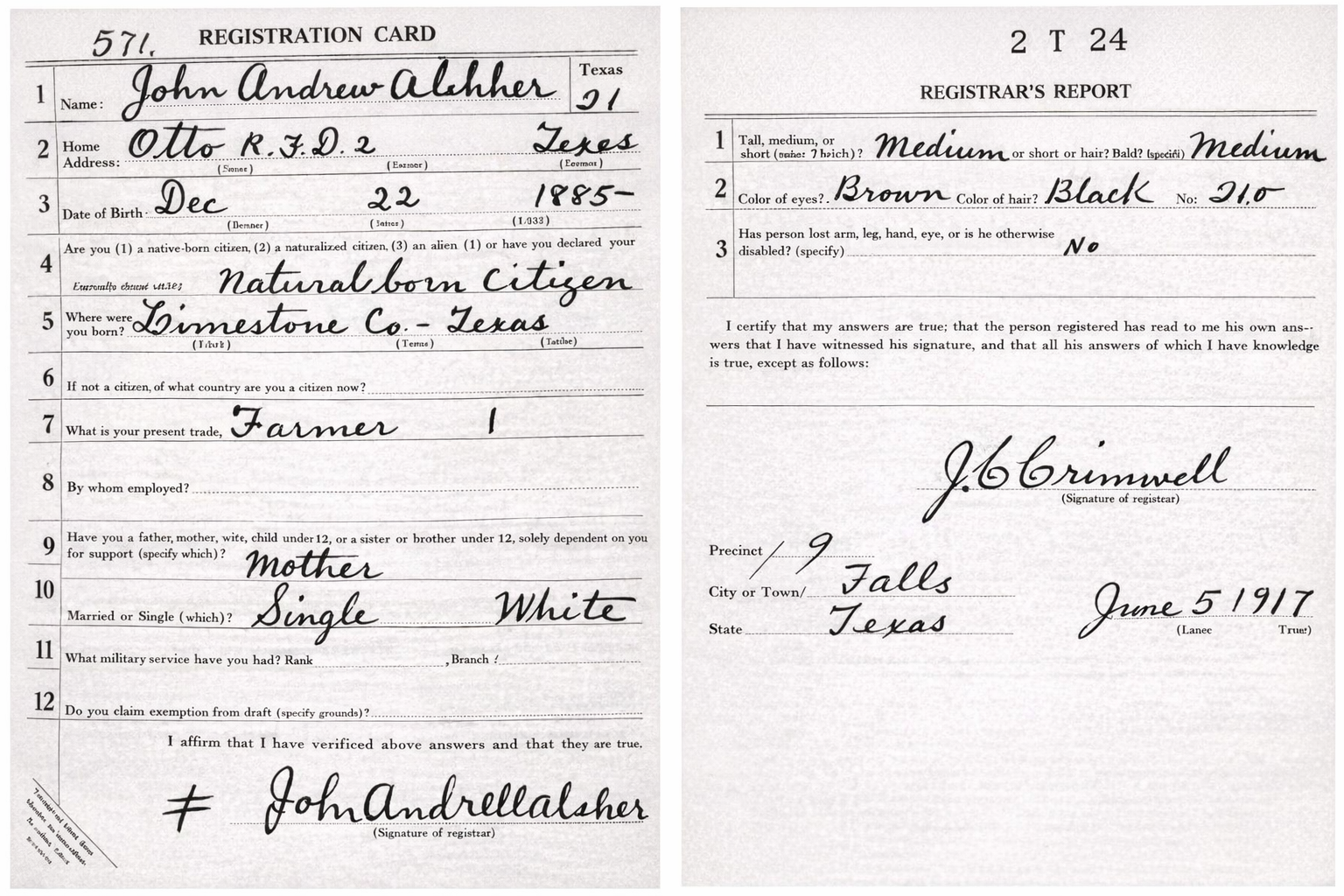 Mr. Absher was born near Groesbeck Dec. 22, 1895.  He resided in the Criswell community and in the Otto area most of his lifetime and engaged in farming.  He started cafe work about 1936 and in 1947 he moved from Otto to Waco and was employed by a cafe there at the time of his death.  He was never married.