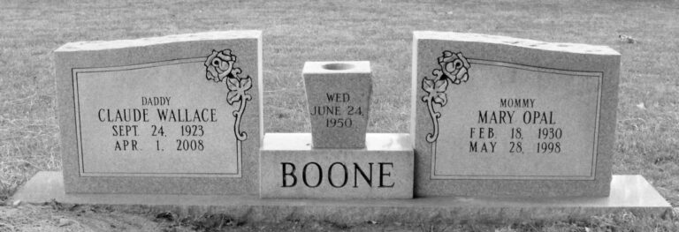 Survivors include her husband, Claude Wallace Boone, who she married June 24, 1950; her mother, Gertrude Stone Jennigan of Conroe, TX; two sons, Barry Hartnett of Ben Hur and Harley Boone of Pasadena, TX; two daughters, Mary Beth Semosh of Ben Hur and Claudia Sutherland of Windom, TX; one sister, Teresa S. Reeves of Sheridan, Arkansas; one brother, Billy A. Stone of Conroe, TX; nine grandchildren; and six great-grandchildren.
