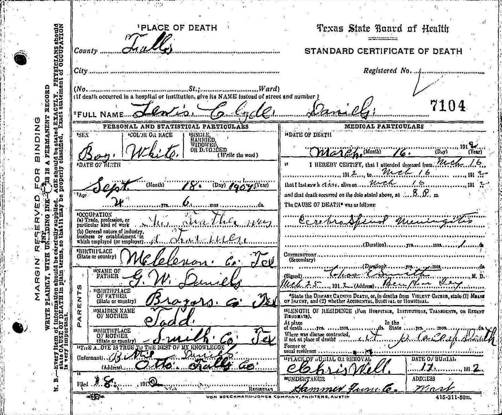 Death place: Falls Co., Texas